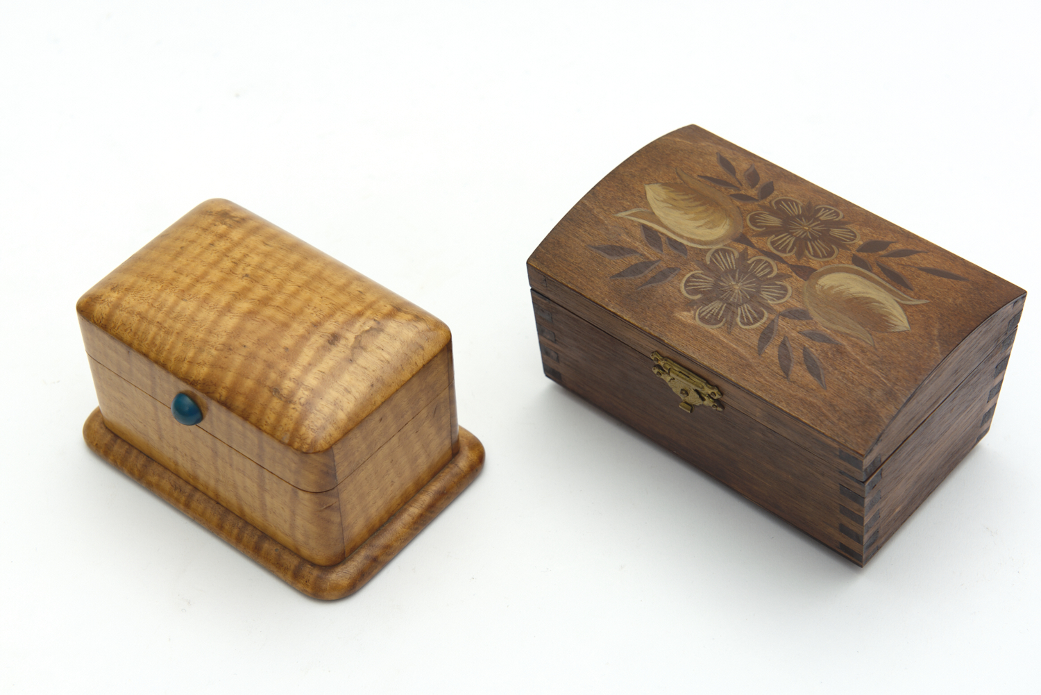 AN ART DECO SATINWOOD PLAYING CARD BOX TOGETHER WITH ANOTHER WOODEN BOX WITH DECORATIVE TOP AND PLAYING CARDS