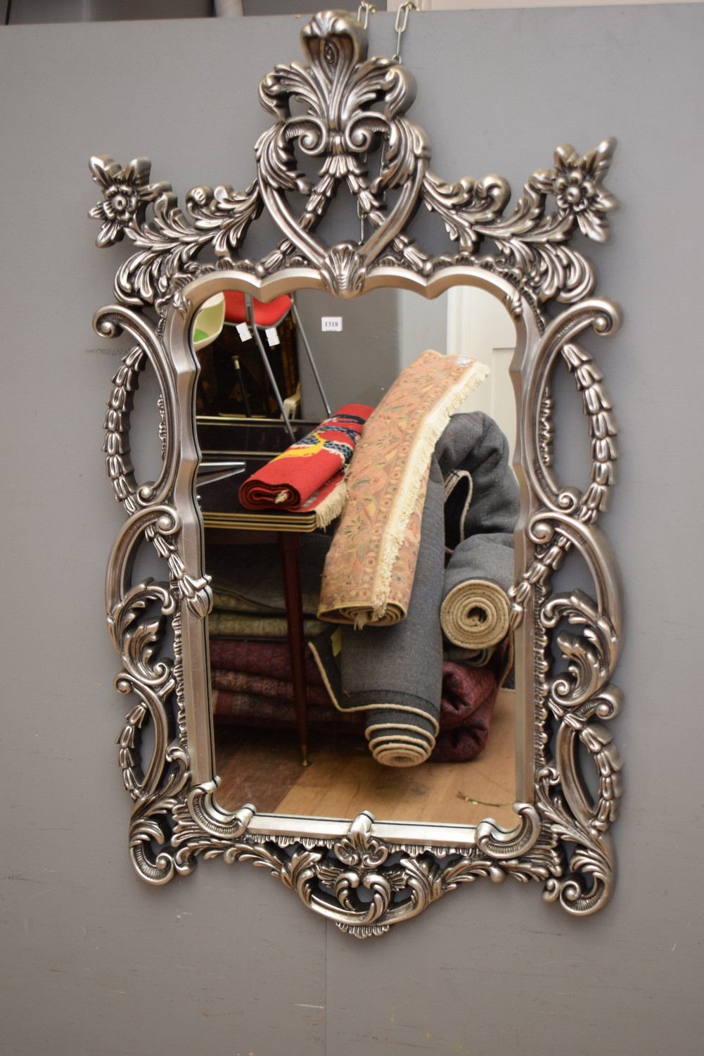 A HIGHLY DECORATIVE SILVER WALL MIRROR (124H X 68W CM) (MEDIUM ITEM)