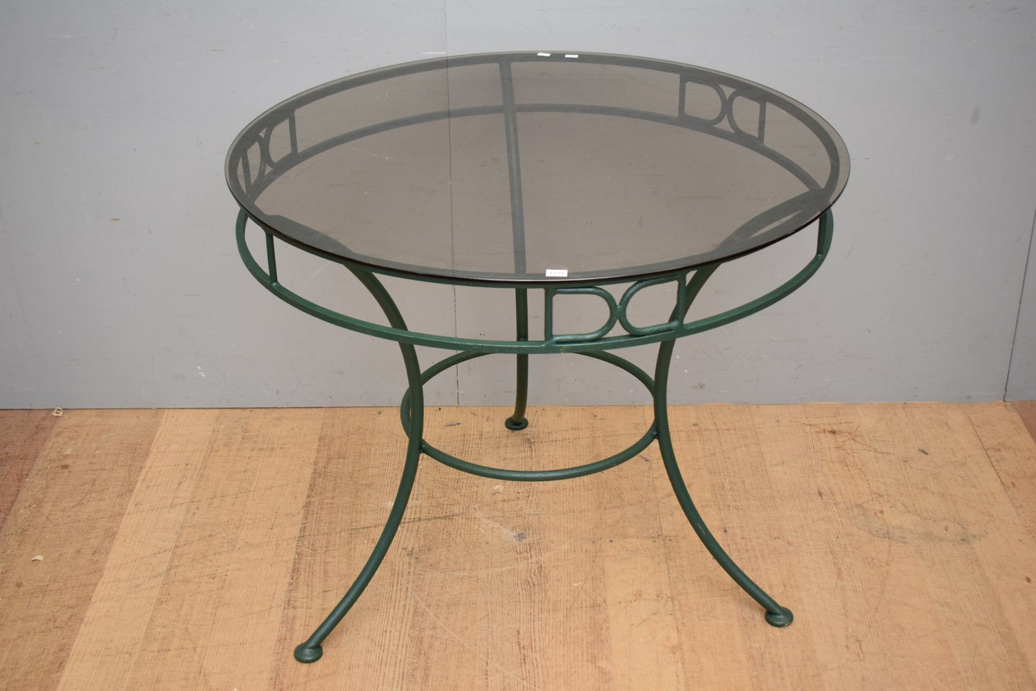 A CIRCULAR METAL WROUGHT IRON TABLE WITH SMOKED GLASS TOP (75H X 92D CM)