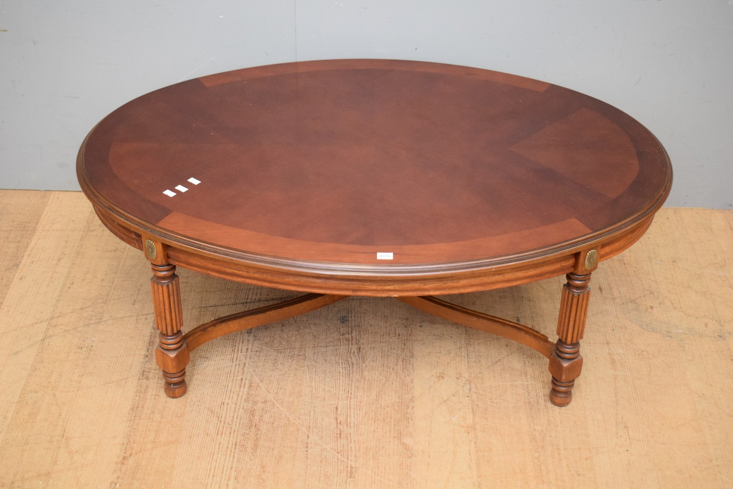 A FRENCH STYLE OVAL INLAID COFFEE TABLE (41H X 112W X 77D CM)