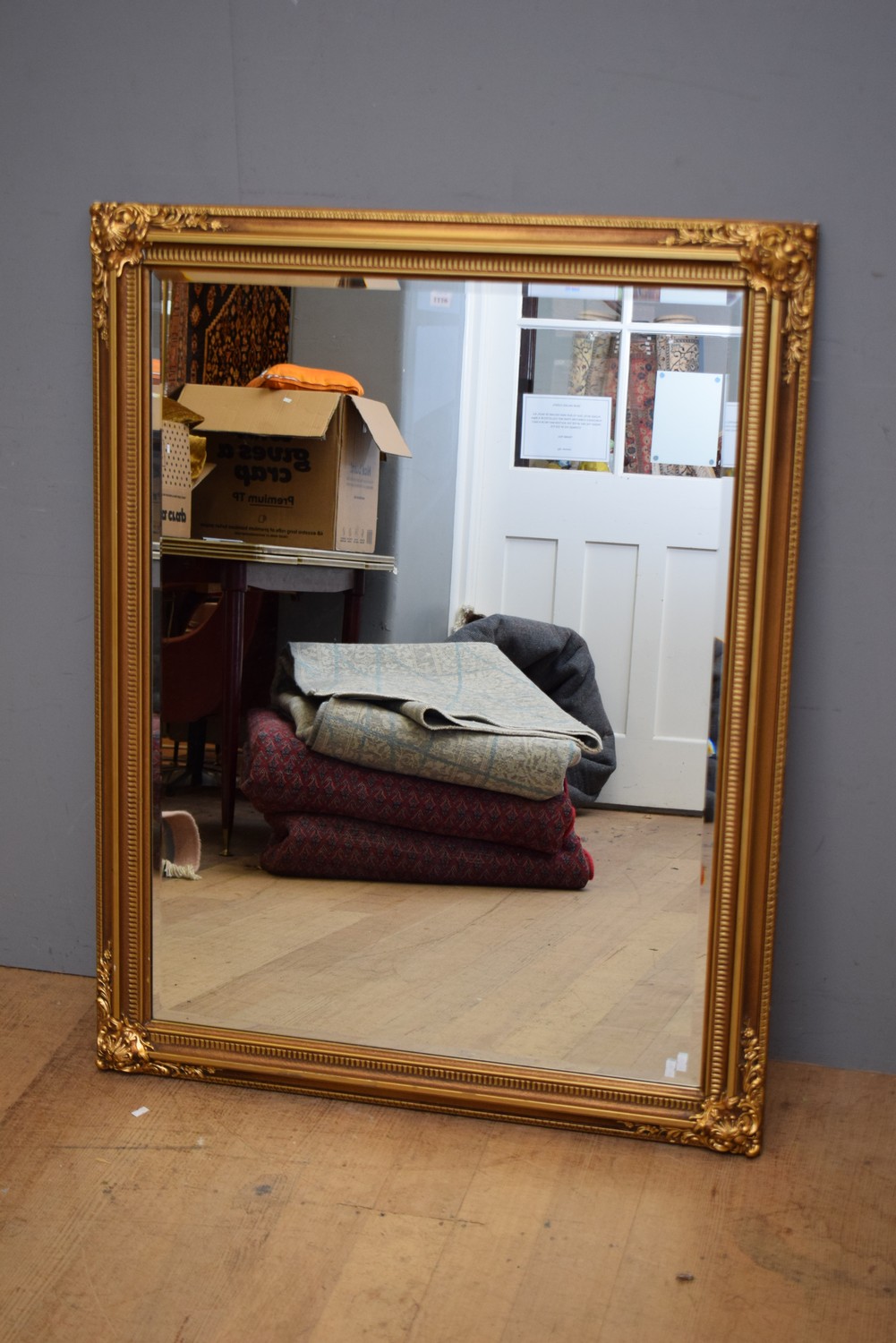 A DECORATIVE GILT EFFECT WALL MIRROR (A/F) (118H X 91W CM)