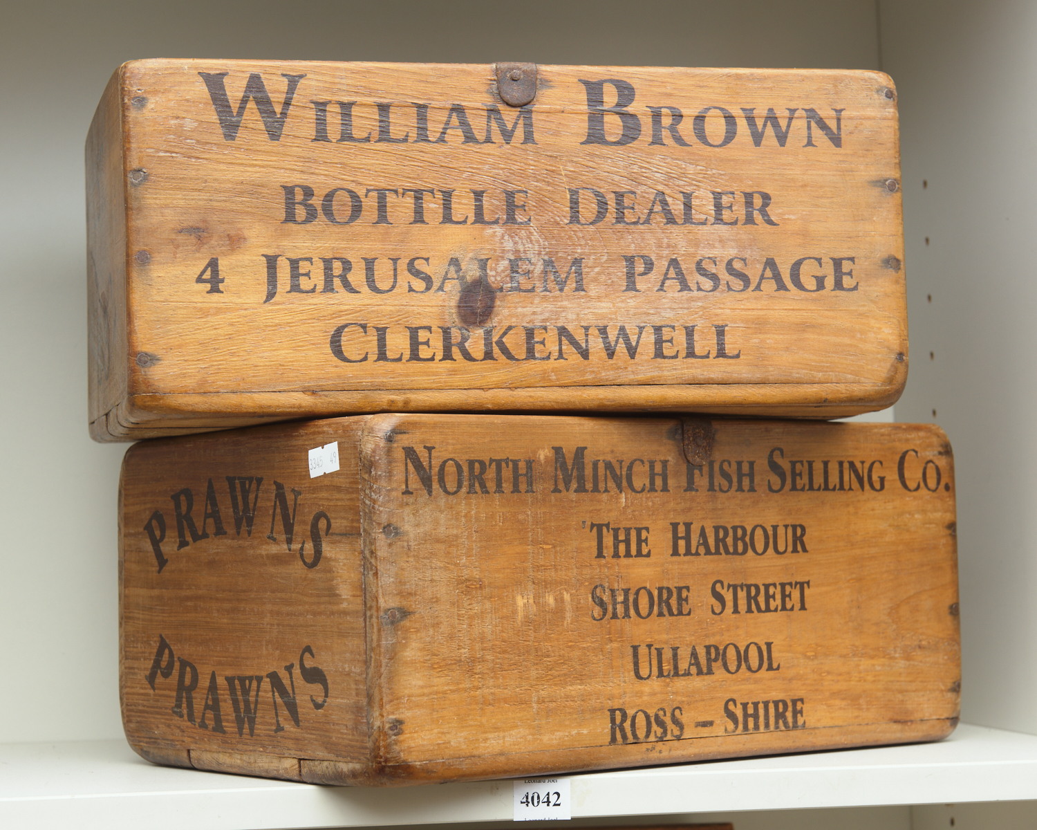 A PAIR OF VINTAGE WOODEN CRATES, 35 CM WIDE, 15.5 CM HIGH, 22 CM DEPTH