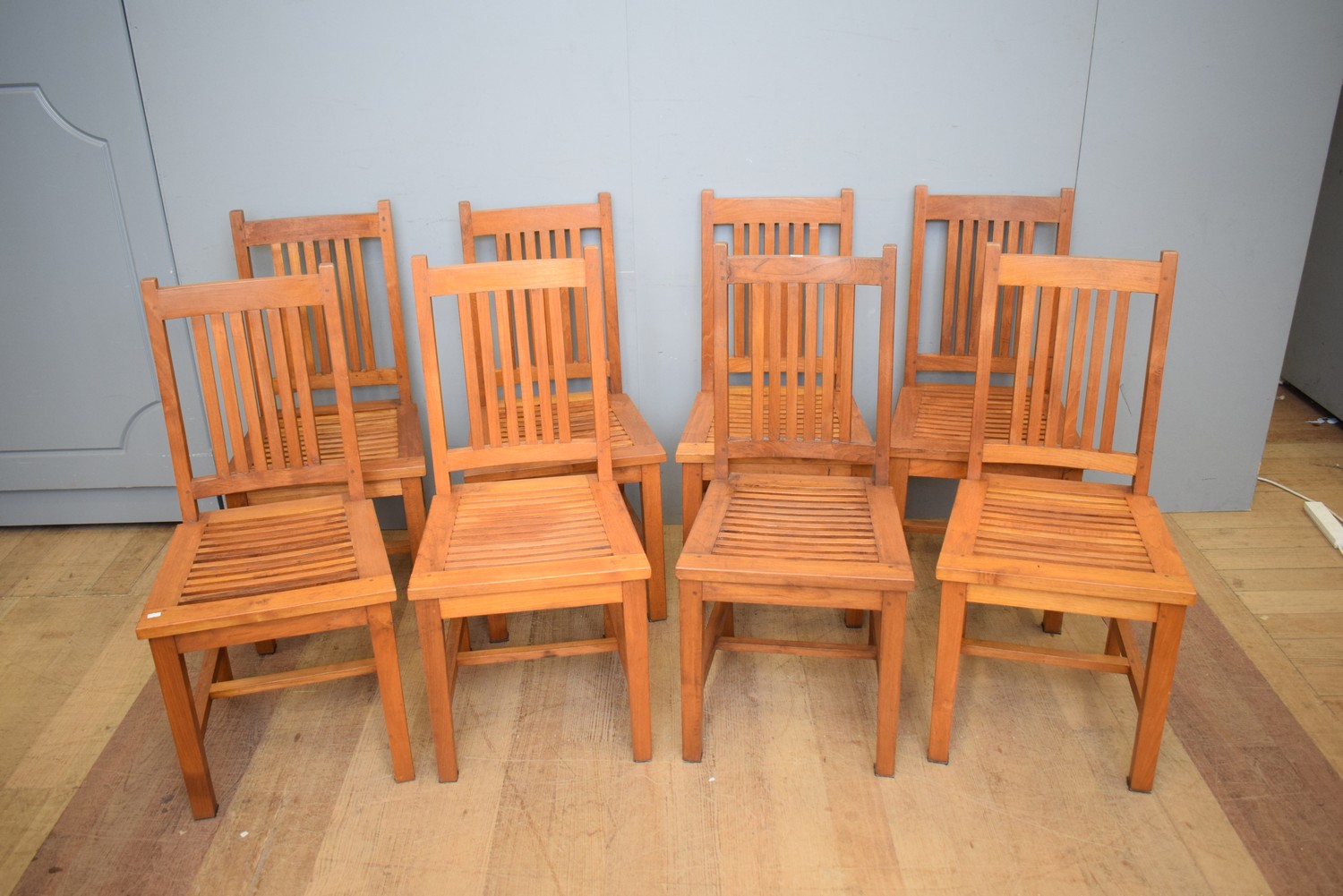 A SET OF EIGHT SOLID TIMBER DINING CHAIRS (96H X 46W X 52D CM) (LARGE ITEM)