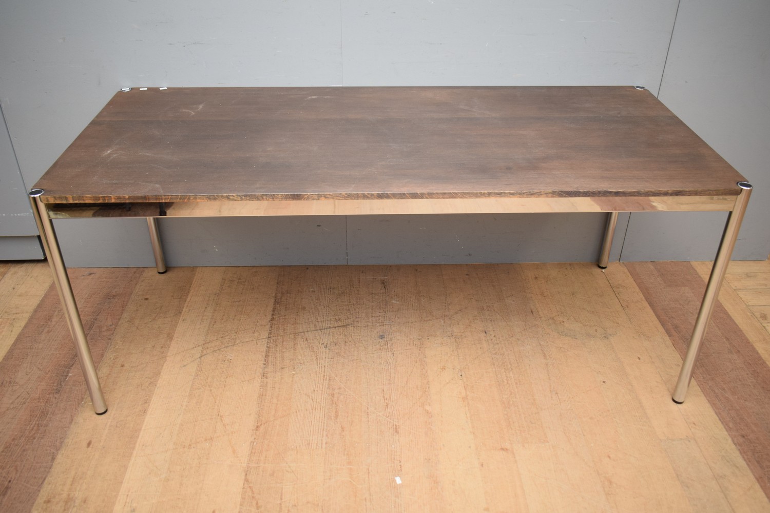 A 'USM HALLER' TIMBER VENEER AND CHROME TABLE MADE IN SWITZERLAND (A/F) ( 74H X 179W X 79D CM)