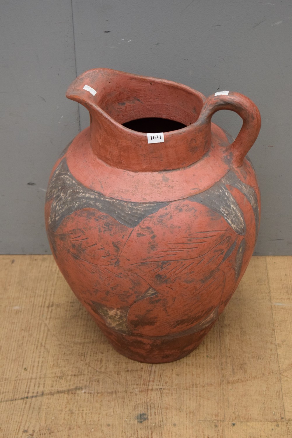 A LARGE VINTAGE INSCRIBED TERRACOTTA PITCHER (52H X 40D CM)