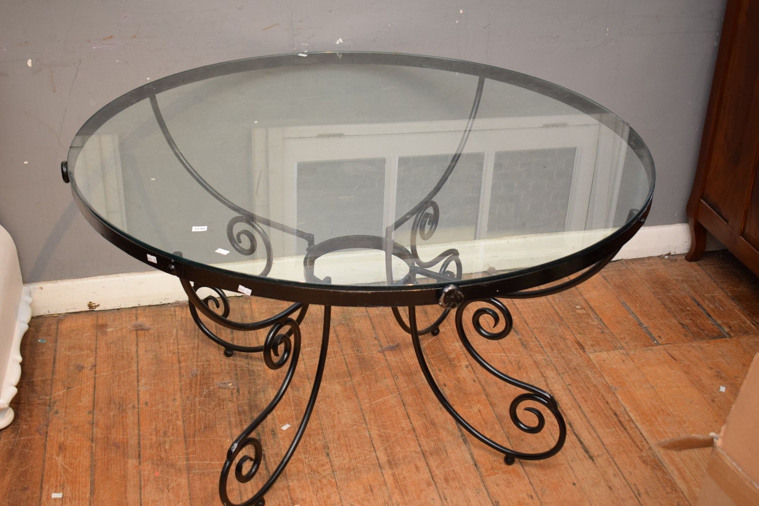 A CIRCULAR WROUGHT IRON GLASS TOPPED TABLE (72H X 122D CM) (LARGE ITEM)