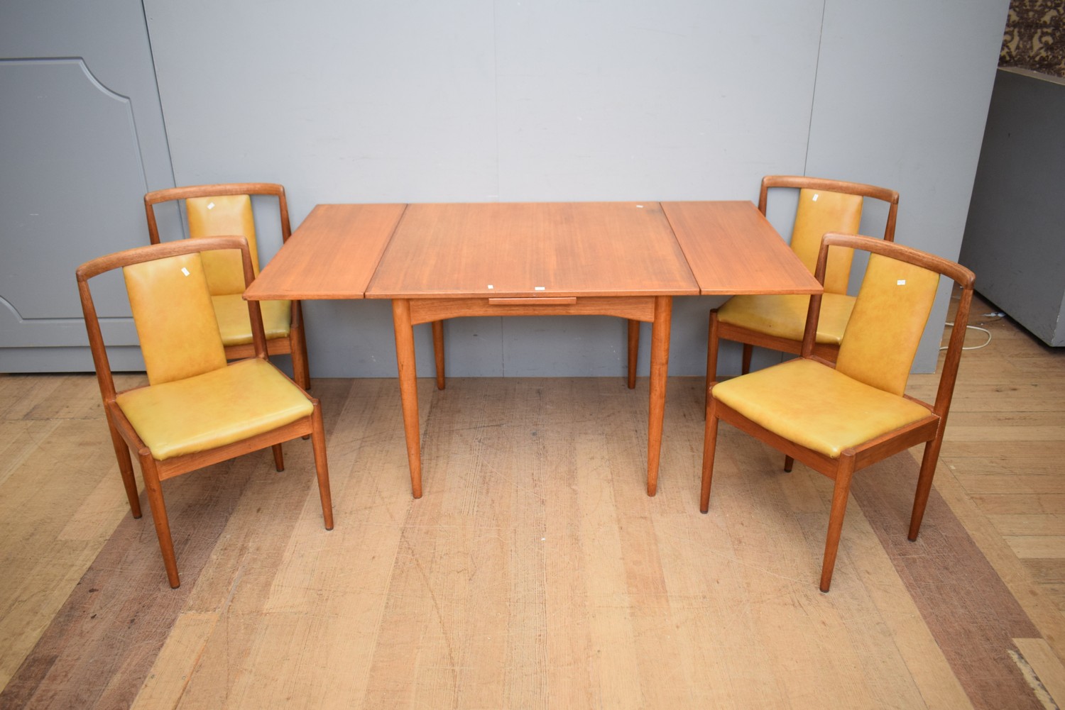 A MID-CENTURY 'PARKER' TEAK FIVE PIECE EXTENDING DINING SUITE (A/F) (72H X 159W X 92CM CHAIRS - 81H X 50W X 52D CM)