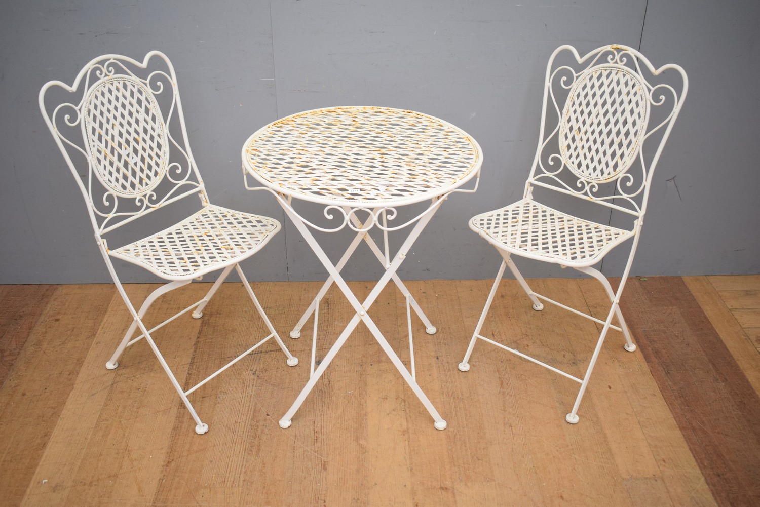 A THREE PIECE OUTDOOR SETTING (A/F) (TABLE 73H X 61D CM)