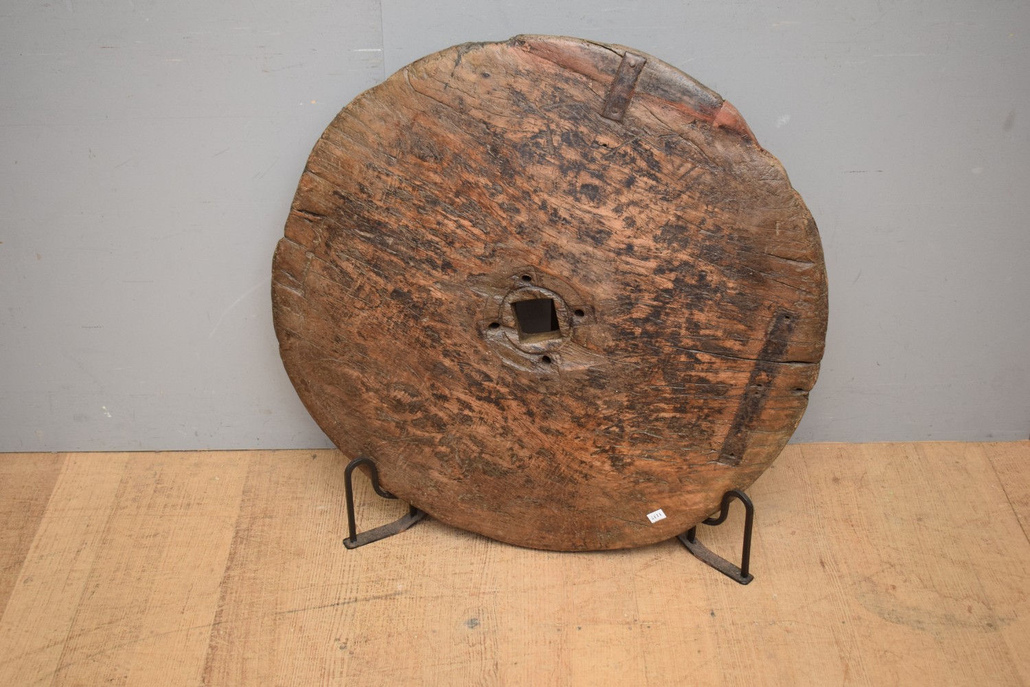 A VINTAGE INDUSTRIAL WHEEL WITH METAL STAND (WHEEL 85 CM D)