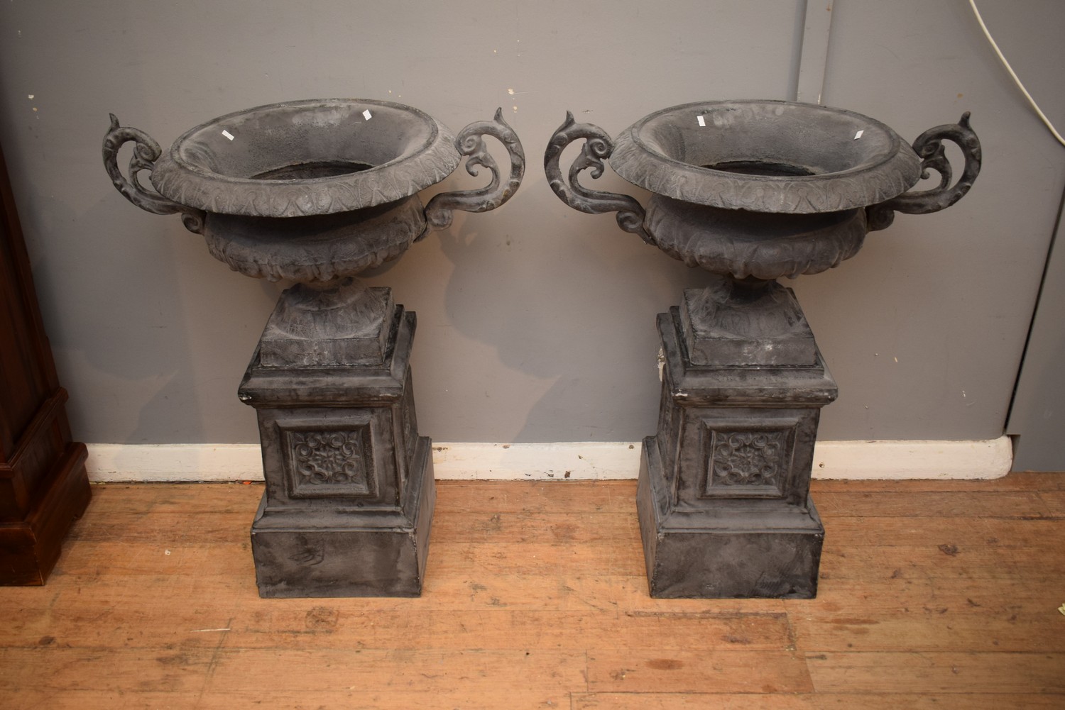 A PAIR OF LEAD FINISHED CAST IRON URNS