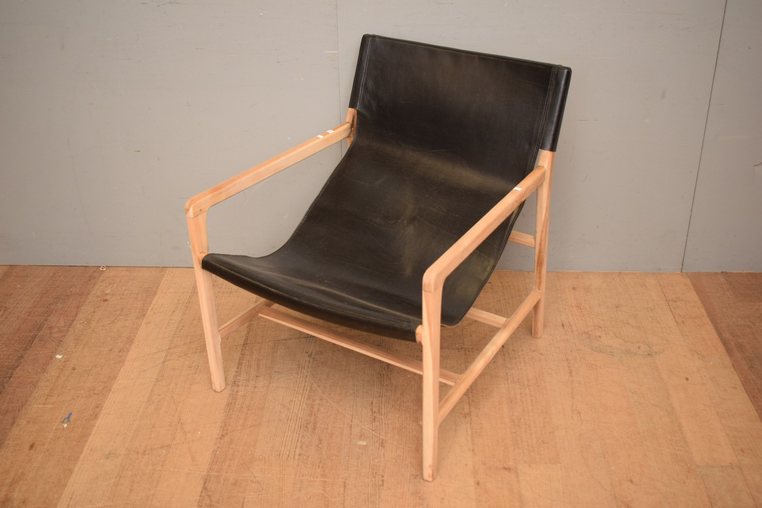 A TEAK AND LEATHER SLING BACK ACCENT CHAIR (79H X 70W X 79D CM)