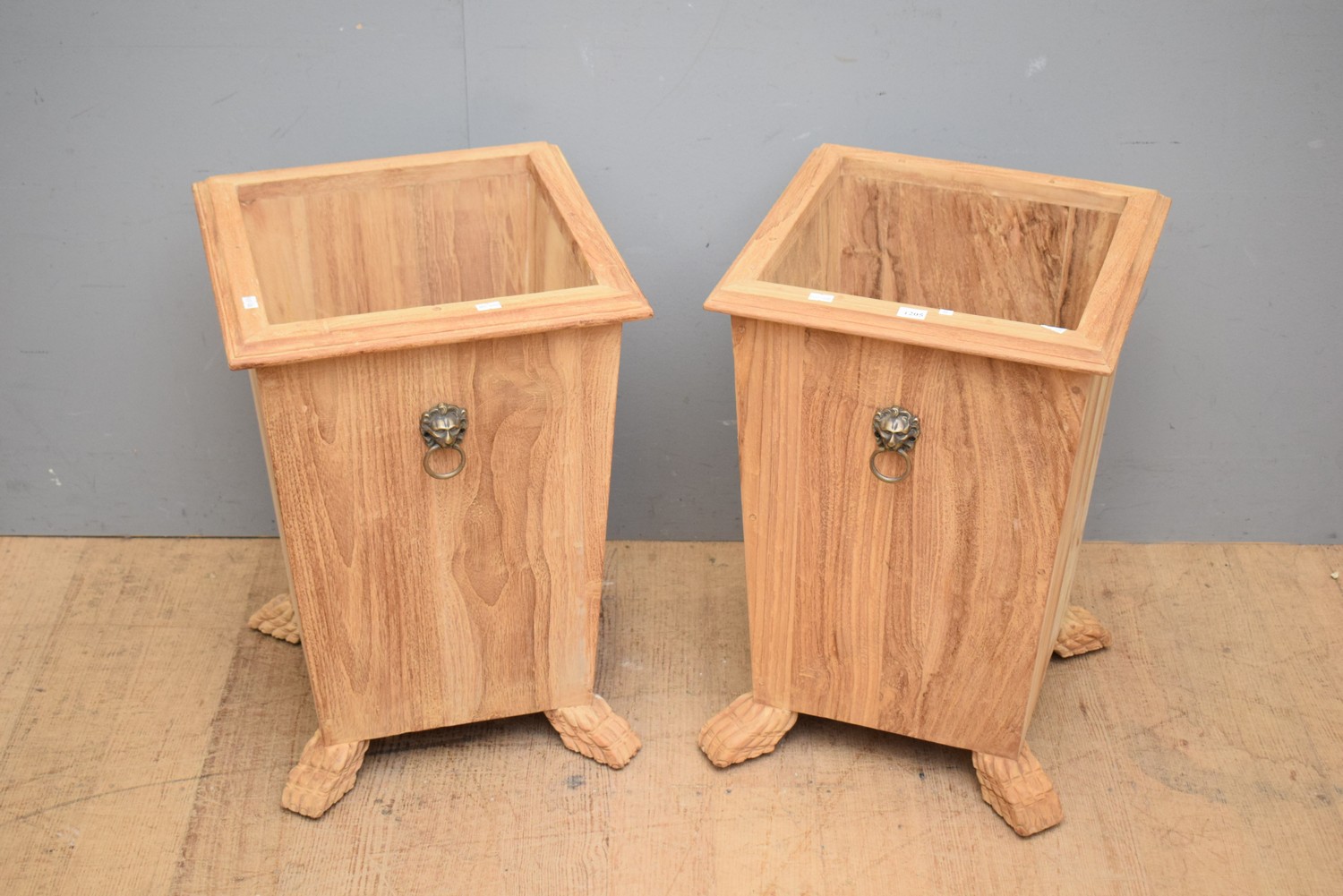 A PAIR OF TEAK PLANTERS WITH BRASS TRIMS (57H x 38W x 38D CM) (MEDIUM ITEM)