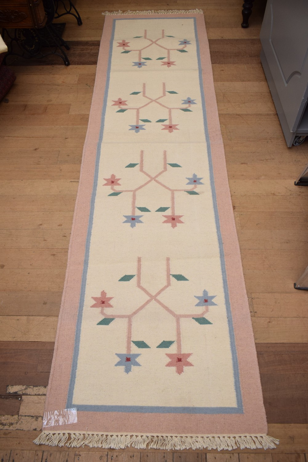 A HAND WOVEN INDIAN WOOLLEN REVERSABLE DHURRIE, 100% PURE WOOL, COLOURFAST, IN A FLORAL DESIGN (305 X 76 CM) (MEDIUM ITEM)