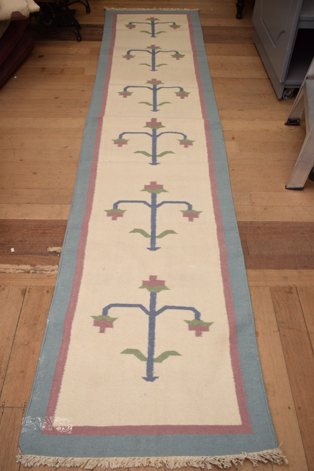 A HAND WOVEN INDIAN WOOLLLEN DHURRIE, REVERSABLE AND COLOURFAST, 100% PURE WOOL, IN A FLORAL DESIGN (364 X 77 CM) (MEDIUM ITEM)