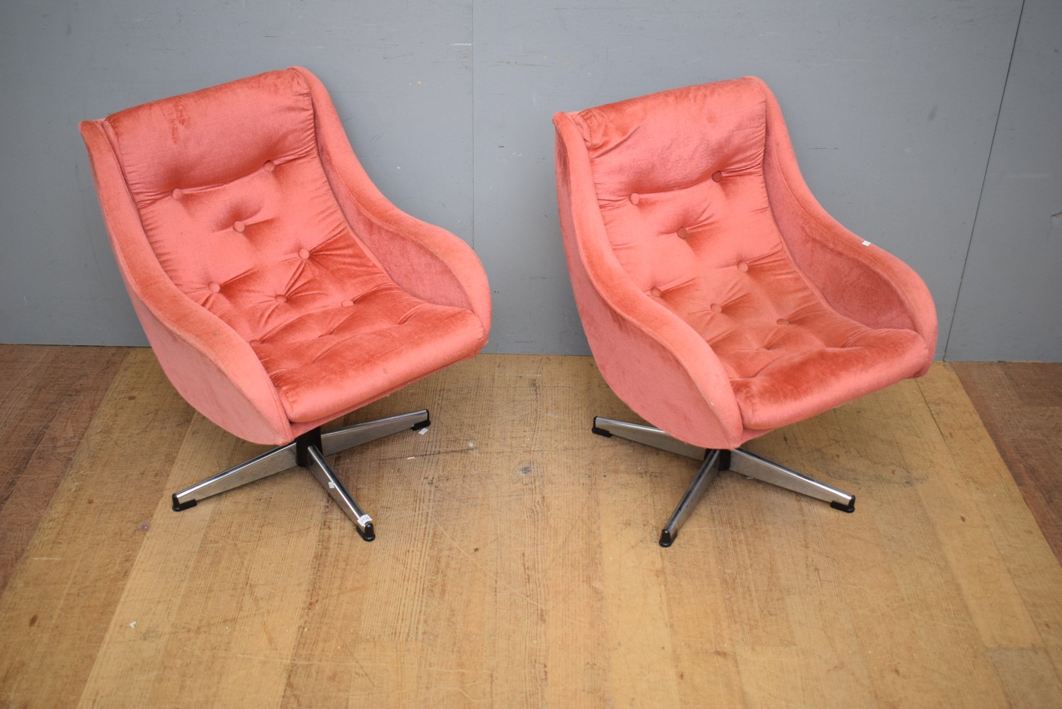A PAIR OF MID-CENTURY PETITE PINK VELOUR SWIVEL CHAIRS (A/F) (72H X 59W X 63D CM)