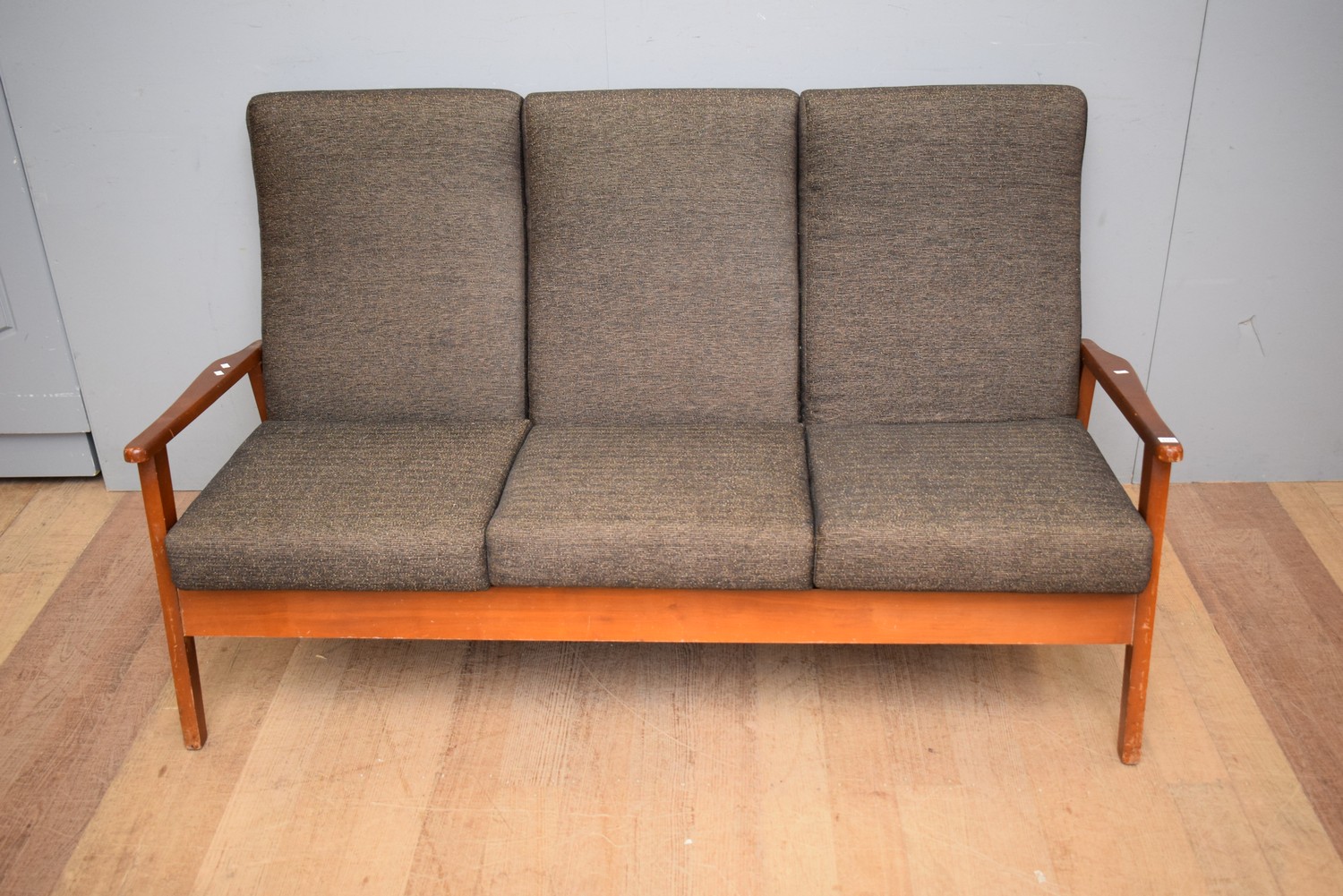 A MID-CENTURY THREE SEATER SOFA (A/F) (90H X 165W X 76D CM)