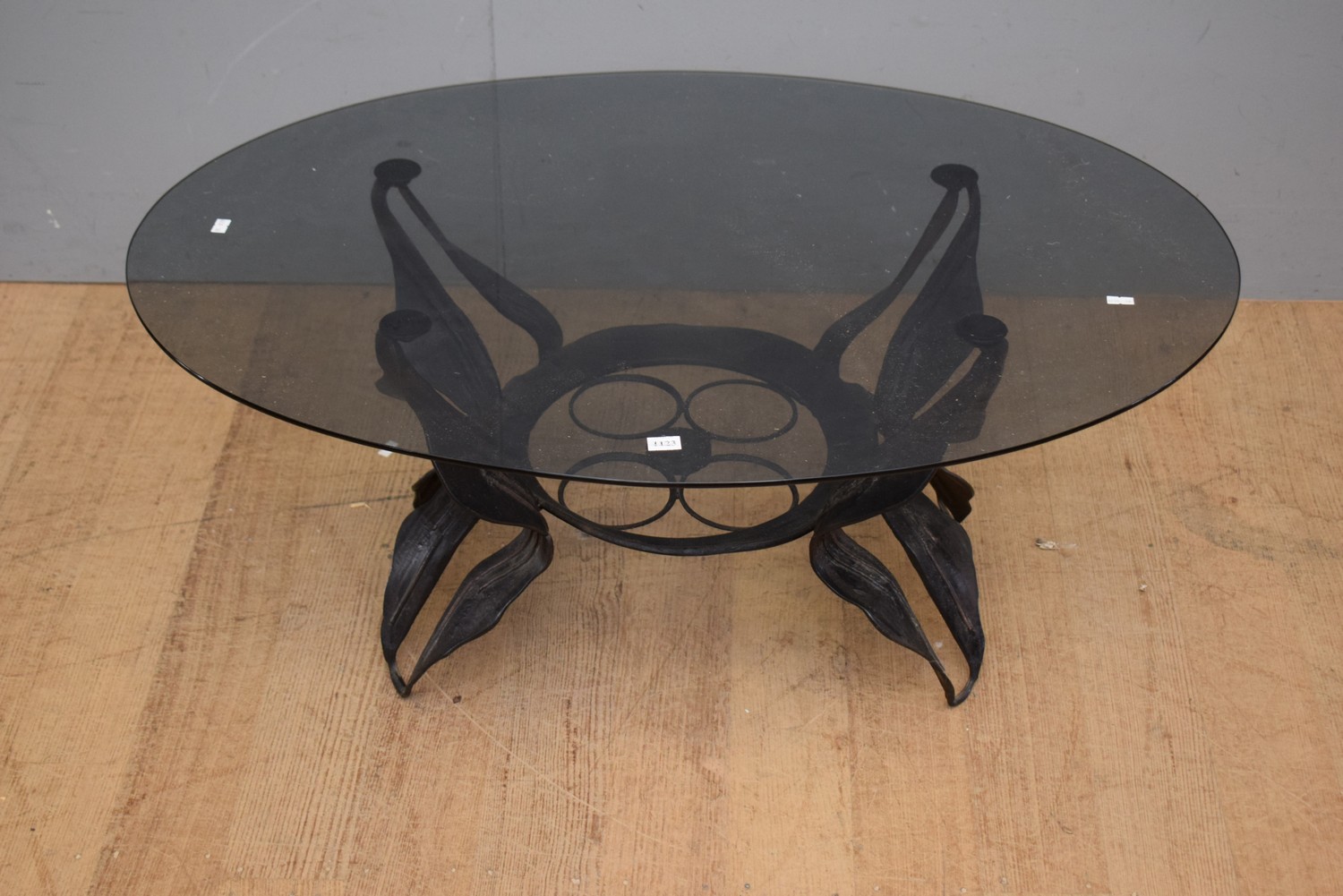 A MID-CENTURY SMOKED GLASS COFFEE TABLE (39H X 96W X 69D CM)