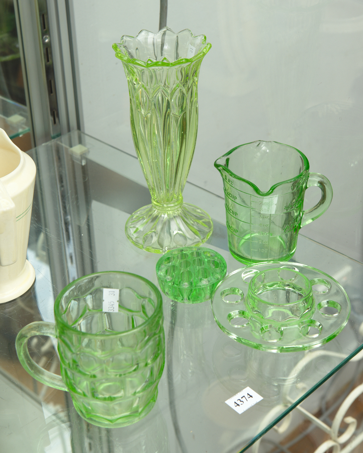 VINTAGE DEPRESSION GLASS VASE, MEASURING JUG, MUG AND FROGS