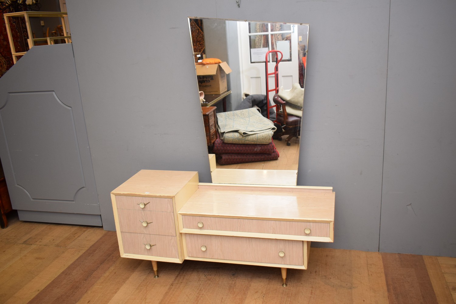 A MID-CENTURY MIRROR BACKED DRESSER (A/F) (172H x 142W x 44D CM)