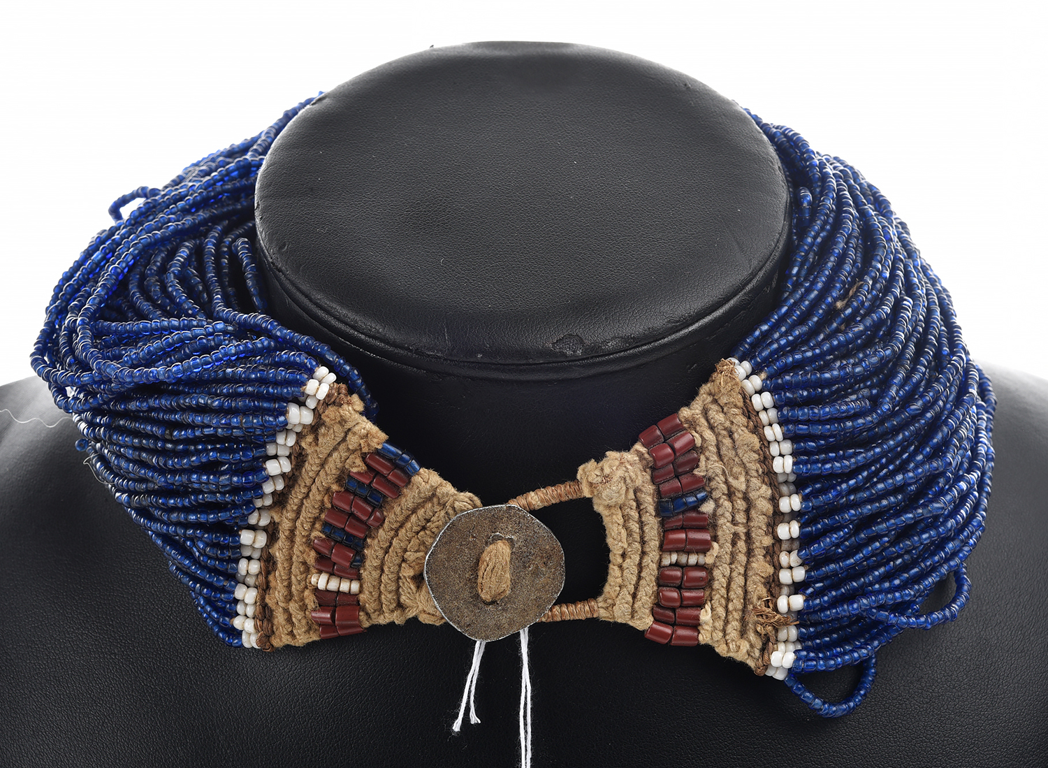 AN ETHNIC MULTI-STRAND BLUE BEAD NECKLACE, LENGTH 39CM