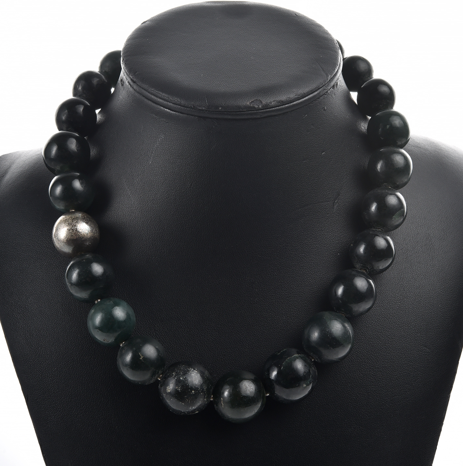 A GREEN AND SILVER BEAD NECKLACE, THE BEADS MEASURING 16.6MM TO 20.7MM, TO A T-BAR CLASP, LENGTH 48.5CM