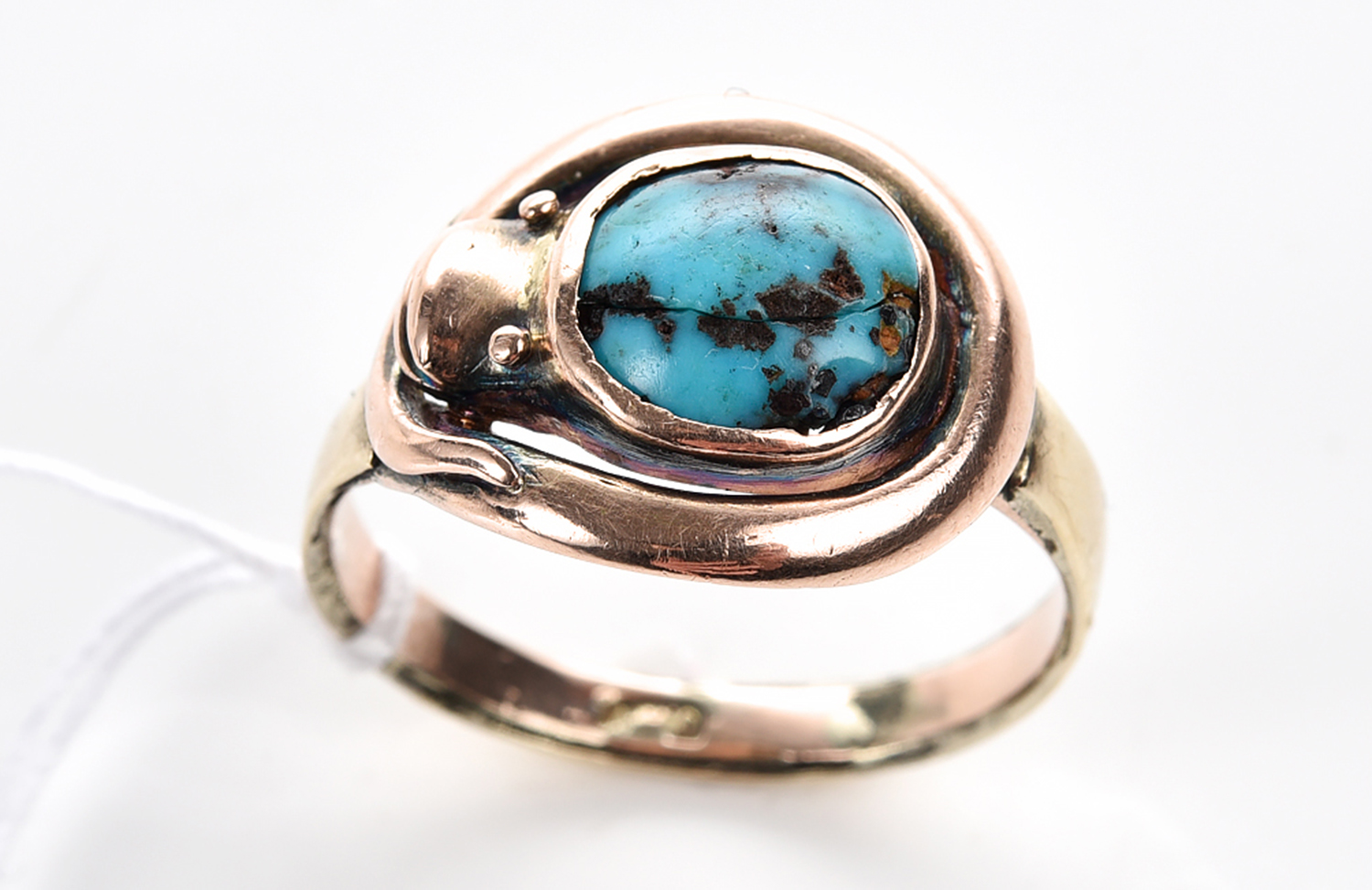 AN ANTIQUE TURQUOISE SNAKE RING IN 9CT GOLD BY JOACHIM MATTHIAS WENDT, SIZE T, 4.3GMS