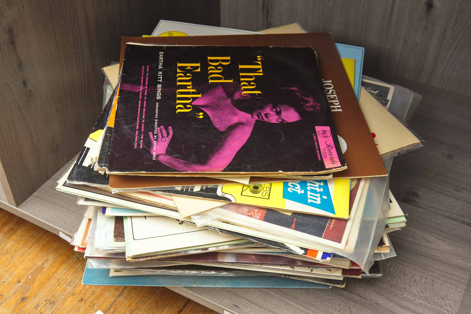A SHELF OF ASSORTED RECORDS INCLUDING EARTHA KITT