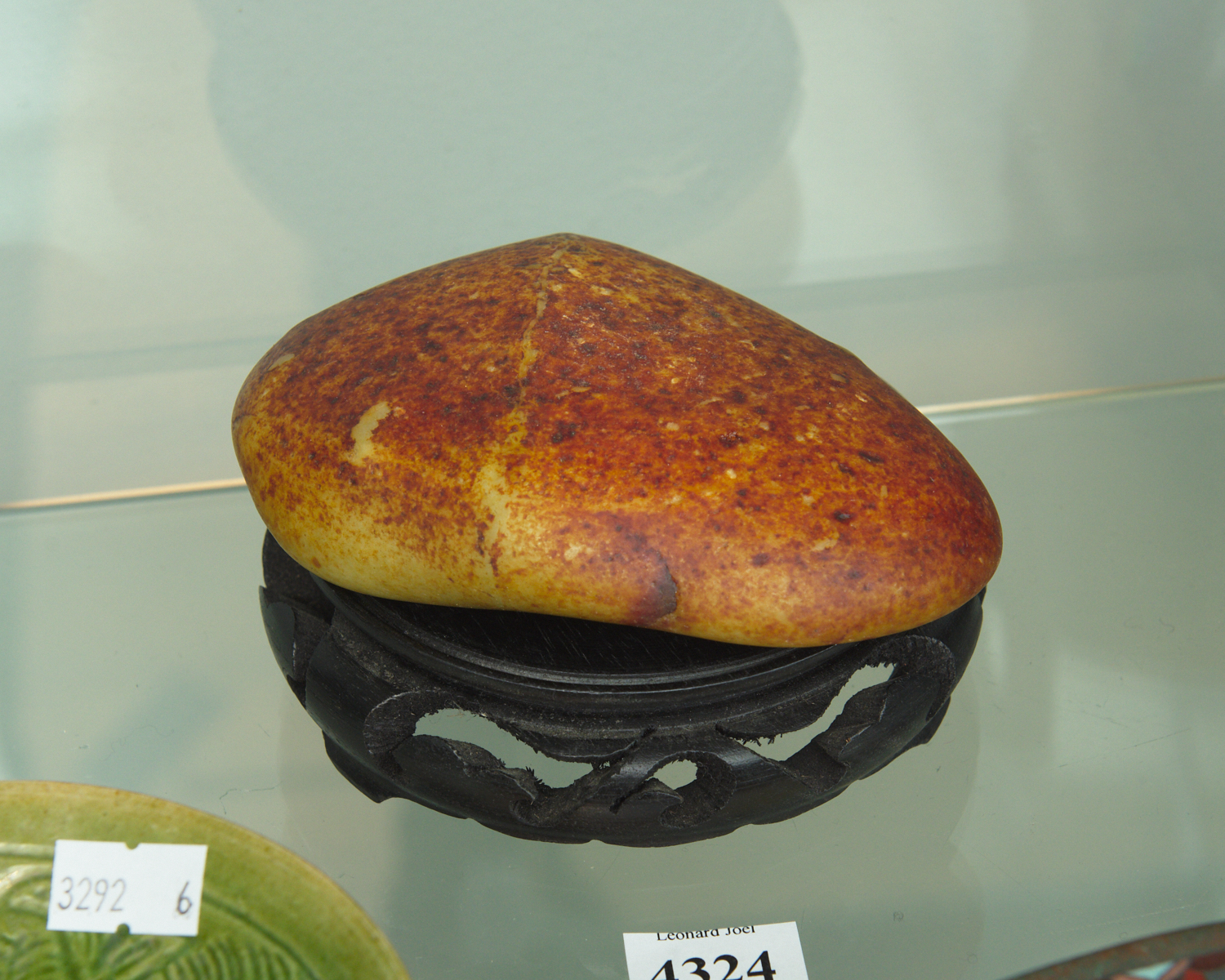 A HARDSTONE SPECIMEN ON WOODEN STAND