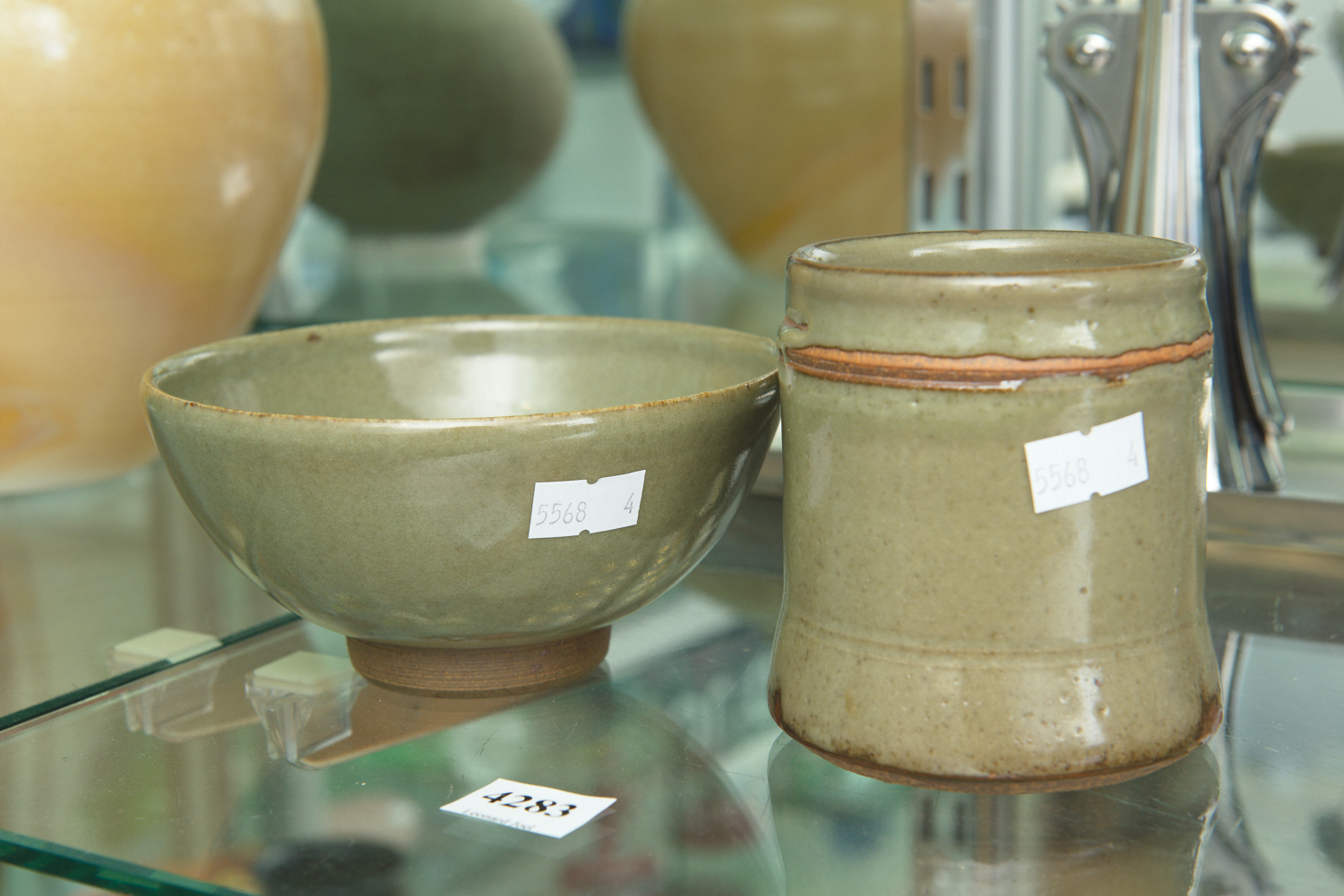 IVAN MCMEEKIN, A STONEWARE MUG AND BOWL (STURT MARK TO BACK), THE BOWL 13 CM DIAMETER, THE MUG 9 CM HIGH