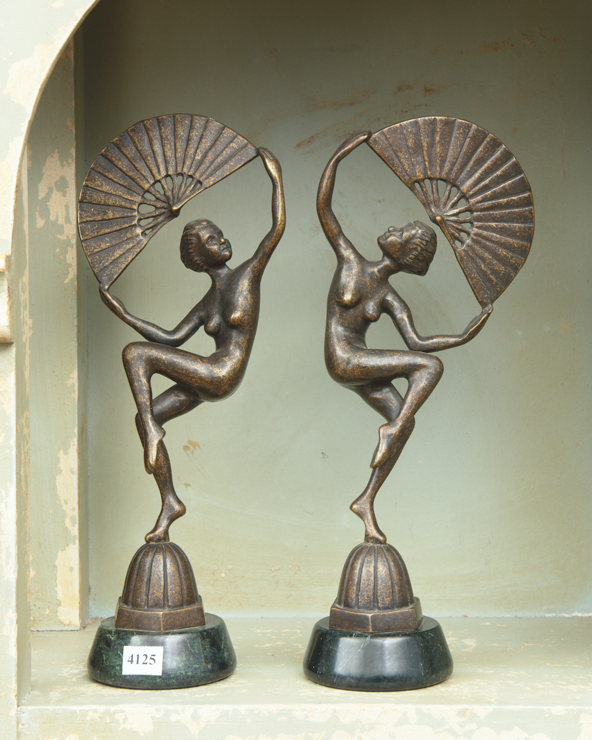 A PAIR OF BRONZE FAN DANCERS ON MARBLE BASES