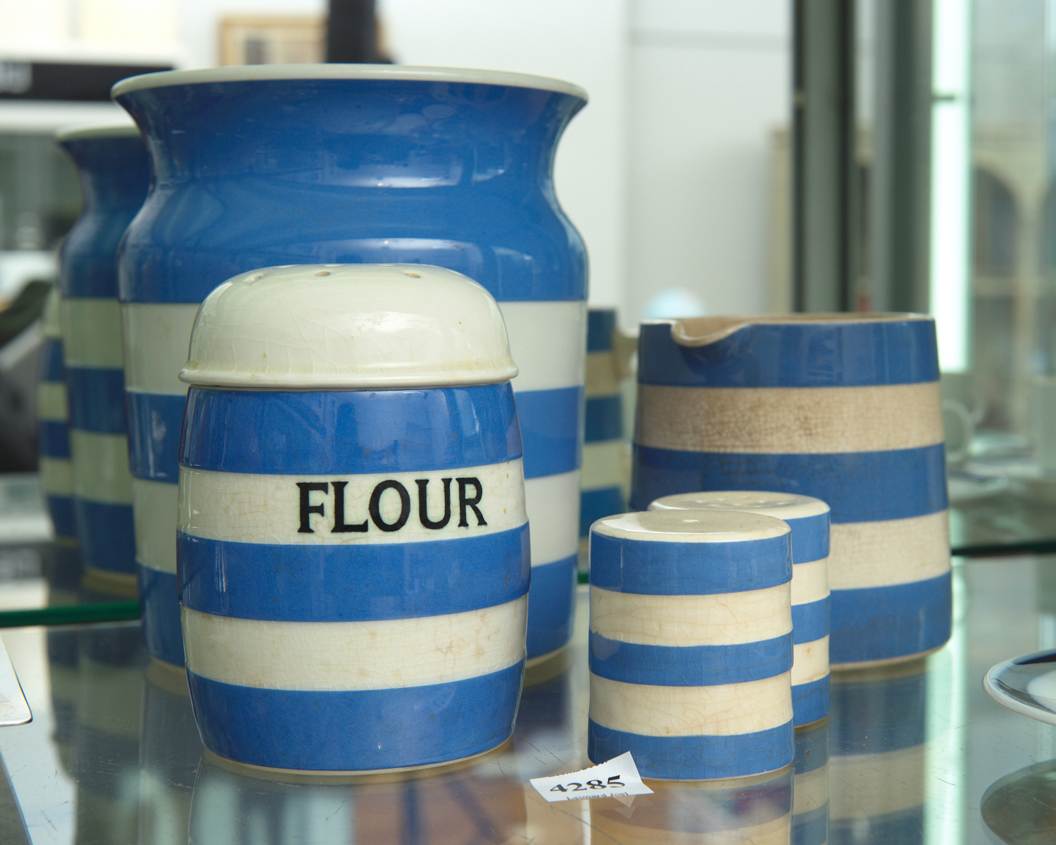 A COLLECTION OF FIVE PIECES OF CORNISH WARE, CANNISTER, THREE CRUETS AND A JUG (JUG A/F), THE CANNISTER 17.5 CM HIGH