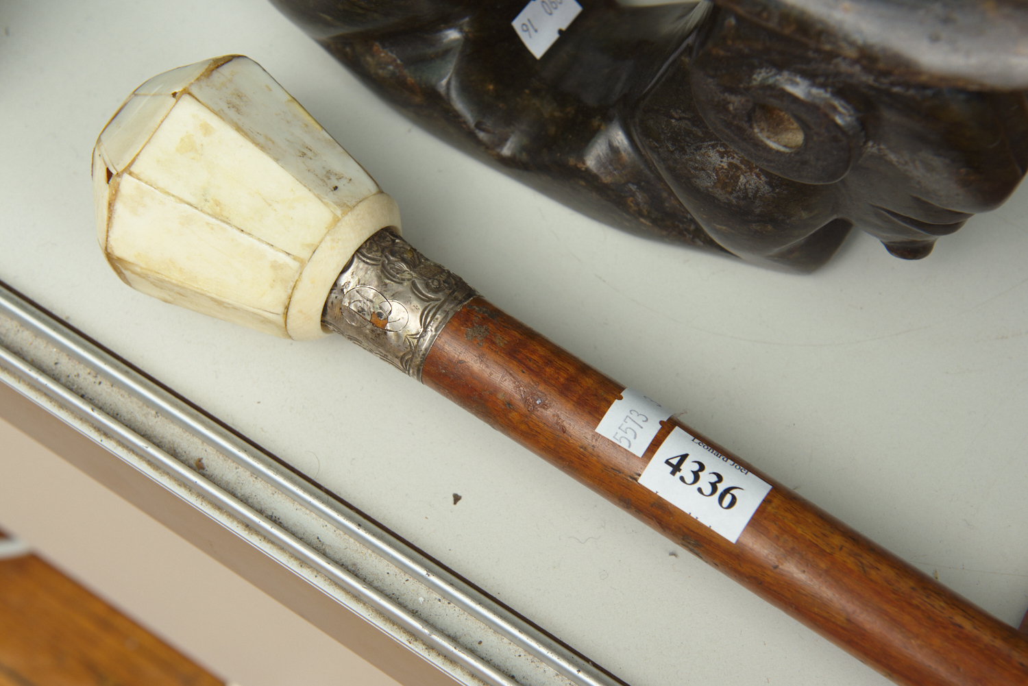 A FIDDLEBACK WALKING STICK, BONE HANDLE