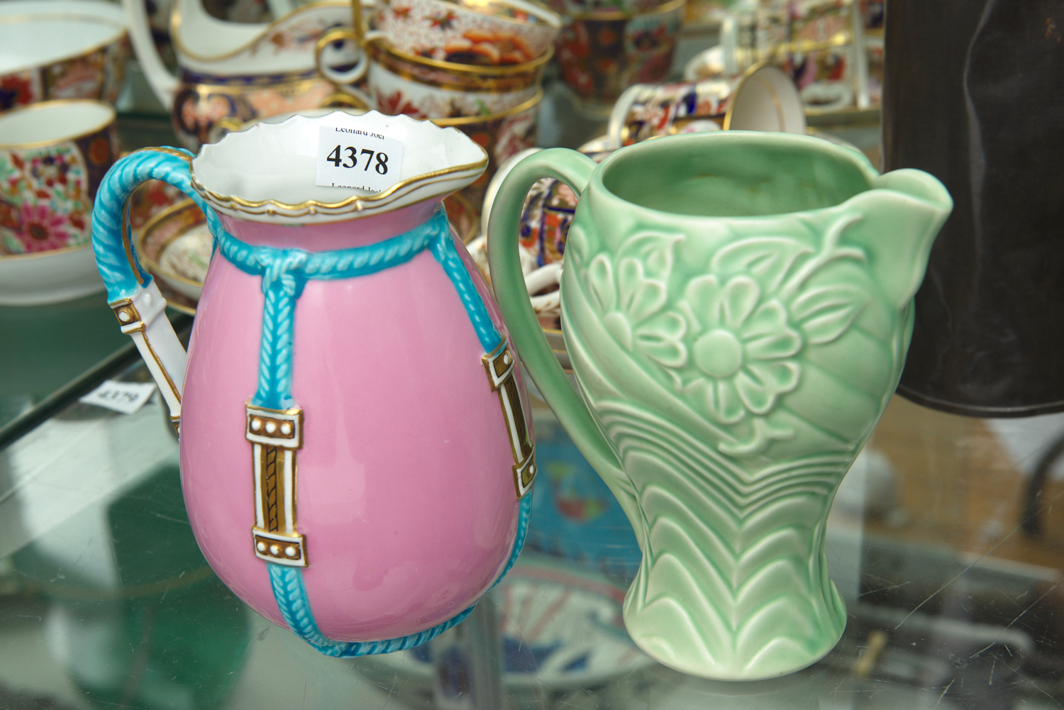 A GREEN GLAZE 'WADE' ENGLISH JUG TOGETHER WITH ANTIQUE FRENCH JUG H.14.5CM