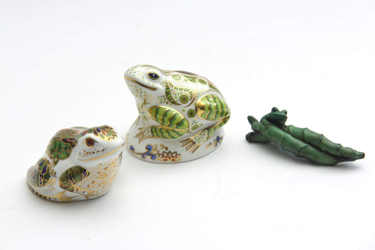 TWO BOXED ROYAL CROWN DERBY PAPERWEIGHTS, INCLUDING 'MULBERRY HALL FROG'; 'TOAD' COLLECTOR'S GUILD EVENT PIECE; TOGETHER WITH AN ADAM BINDER BRONZE FROG ON A LEAF (BOXED)