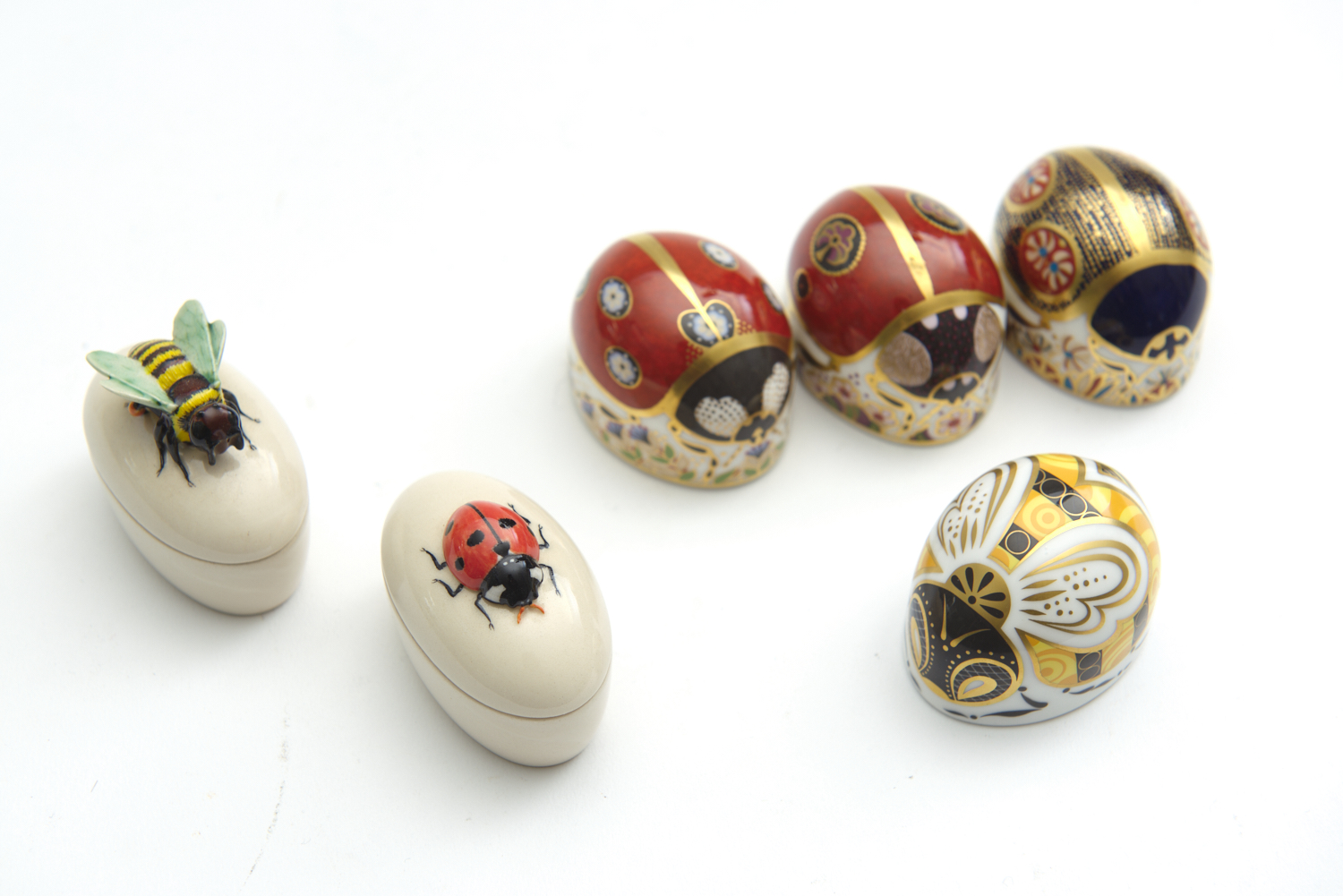 FOUR BOXED ROYAL CROWN DERBY PAPERWEIGHTS, INCLUDING 'BLUE LADYBIRD'; 'TWO SPOT LADYBIRD'; 'BUMBLEBEE'; AND 'SEVEN SPOT LADYBIRD'; TOGETHER AN ALAN PEPPER CERAMICS BEE ON AN OVAL BOX AND AN ALAN PEPPER CERAMICS SEVEN SPOT LADYBIRD