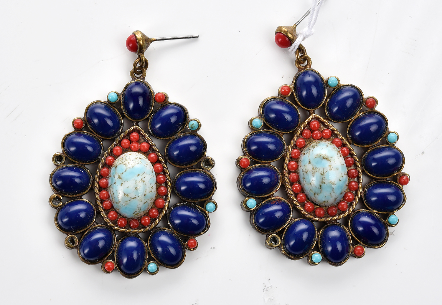 A PAIR OF ETHNIC STONE SET DROP EARRINGS, LENGTH 5CM (MISSING BACKS)