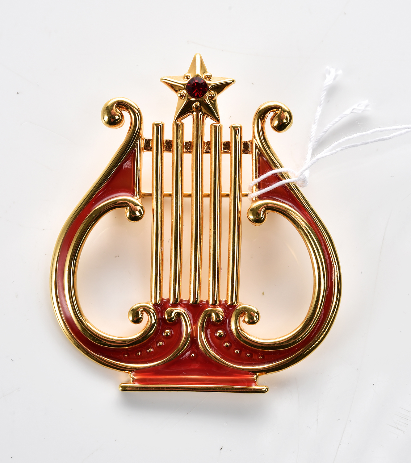 A LYRE ENAMELLED BROOCH, RETAILED BY THE METROPOLITAN MUSEUM, LENGTH 5CM