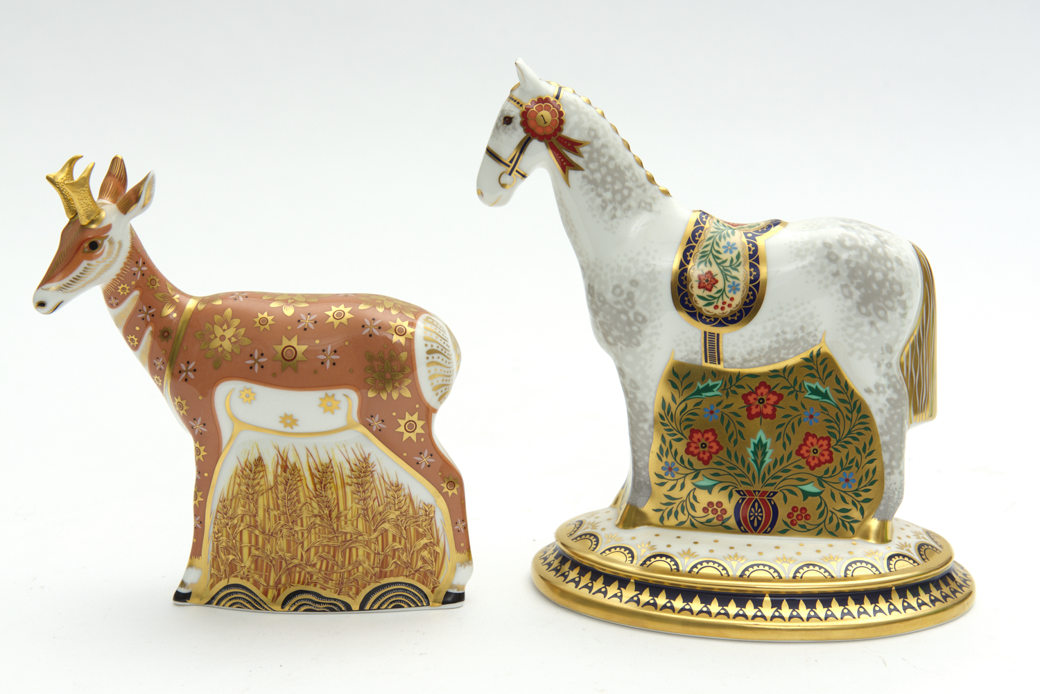 TWO ROYAL CROWN DERBY PAPERWEIGHTS, INCLUDING 'PRONGHORN ANTELOPE'; AND 'SHOW PONY'