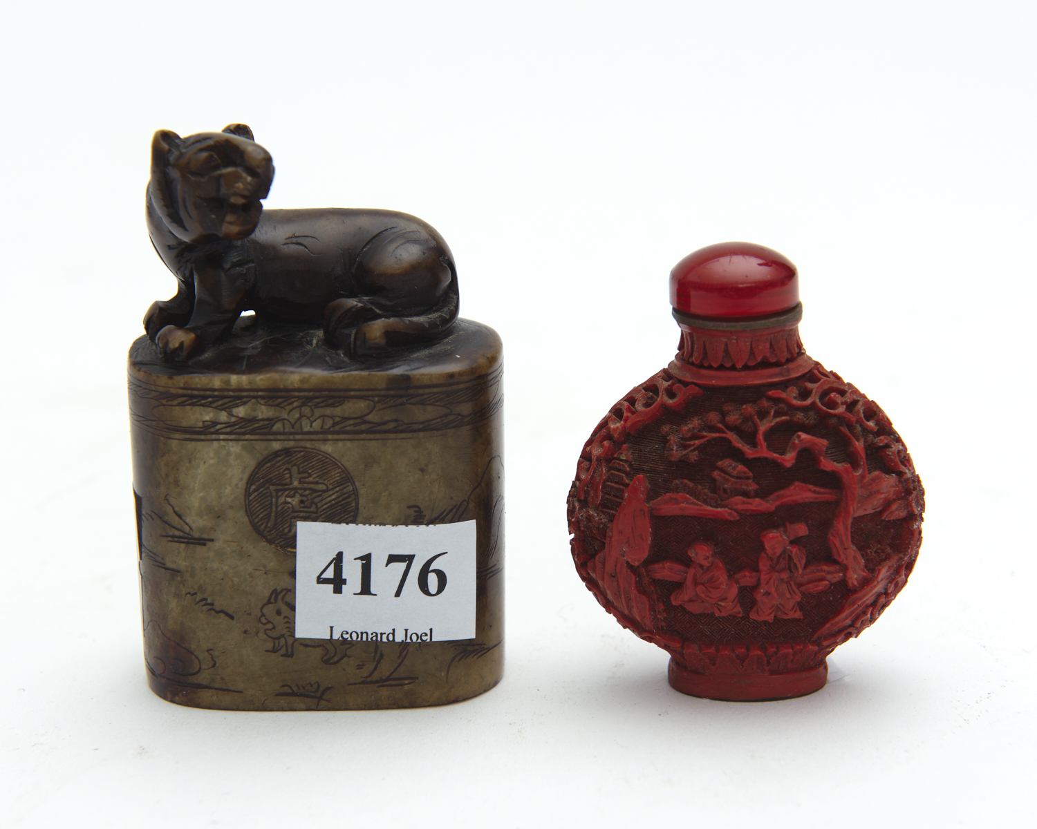 A CHINESE SNUFF BOTTLE AND A SOAPSTONE SEAL