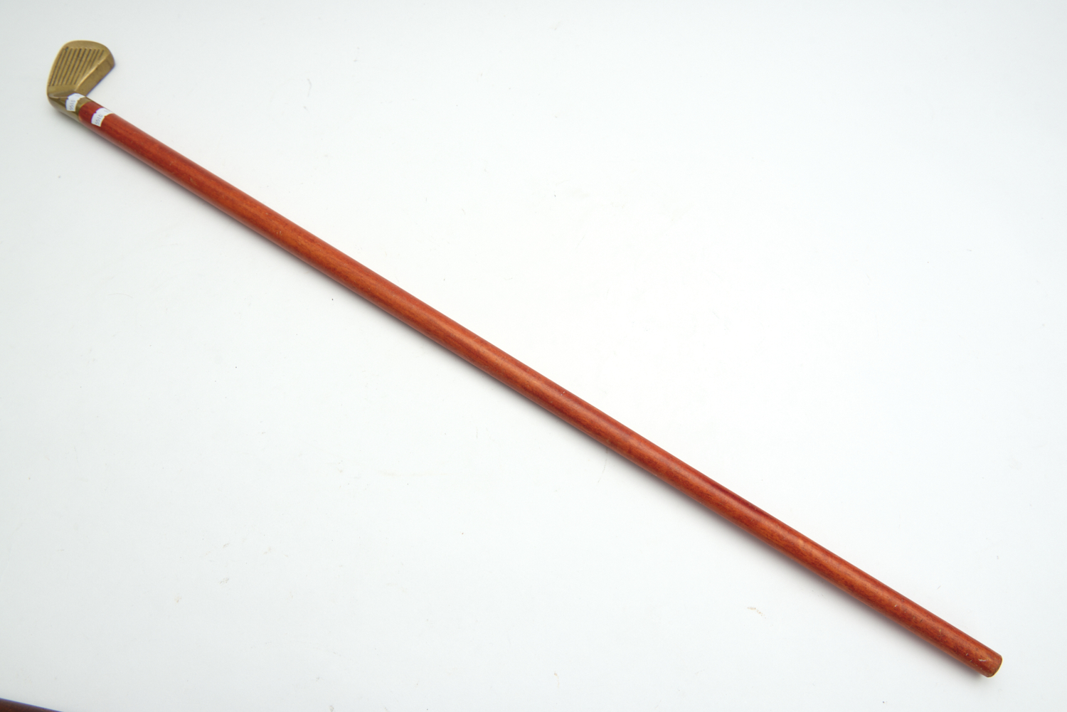A VINTAGE BRASS AND MAHOGANY GOLF PUTTER NOVELTY WALKING STICK/CANE, 95 CM LONG (SMALL DELIVERY)