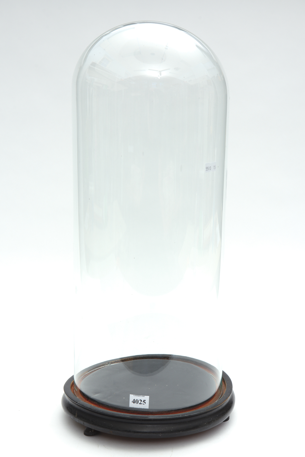 A LARGE AND TALL FRENCH GLASS DOME ON AN EBONISED BASE, 55 CM OVERALL HEIGHT