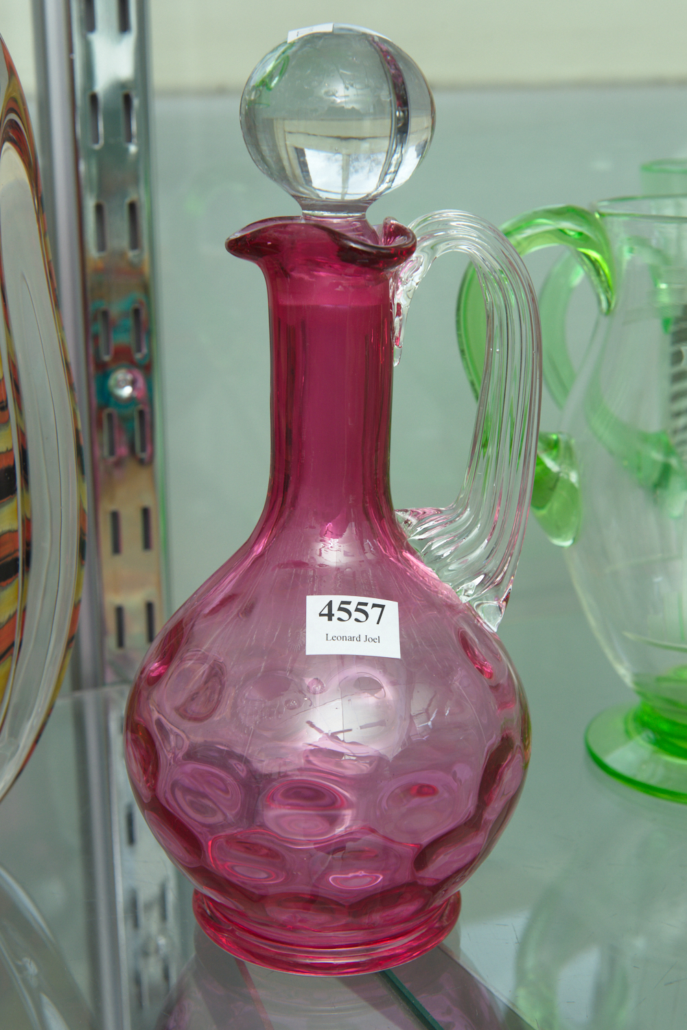 A RUBY AND CLEAR GLASS HANDLED DECANTER WITH STOPPER H.26CM, LEONARD JOEL DELIVERY SIZE: SMALL