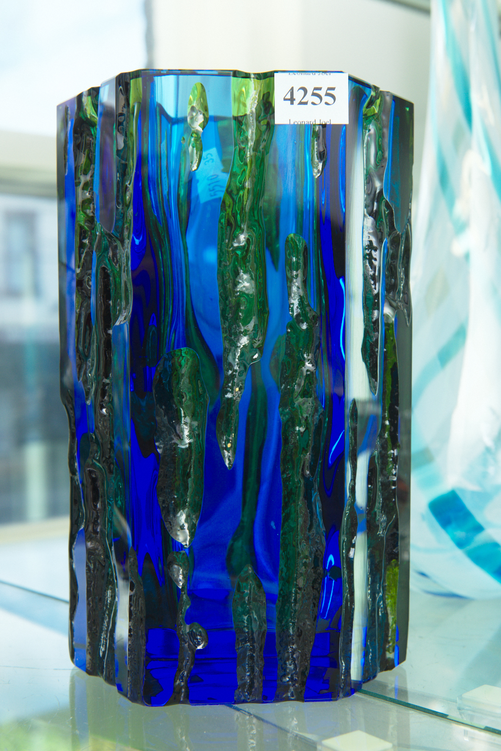 A BRUTALIST BLUE & GREEN GLASS VASE, 21.5 CM HIGH