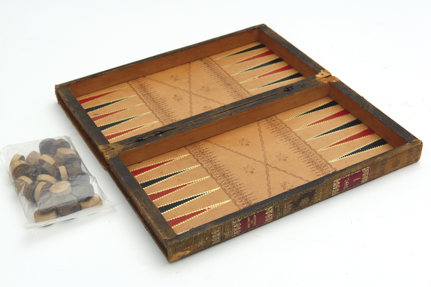A 19TH CENTURY LEATHER BOUND BOOK FORM 'HISTORY OF CANADA' FOLDING CHESS BOARD WITH WOODEN PIECES