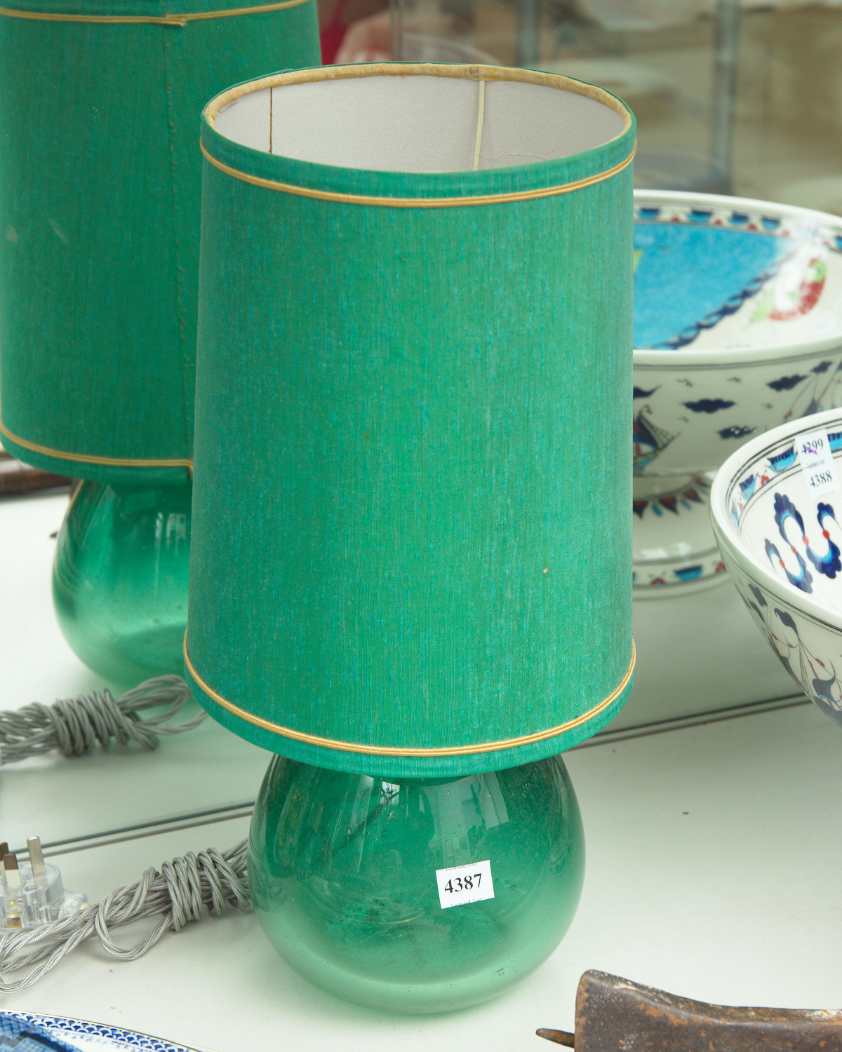 SUPERB 1950S ITALIAN GREEN GLASS LAMP WITH MATCHED SHADE - REWIRED FOR ELECTRICAL SAFETY, 41.5 CM HIGH INCLUDING THE SHADE