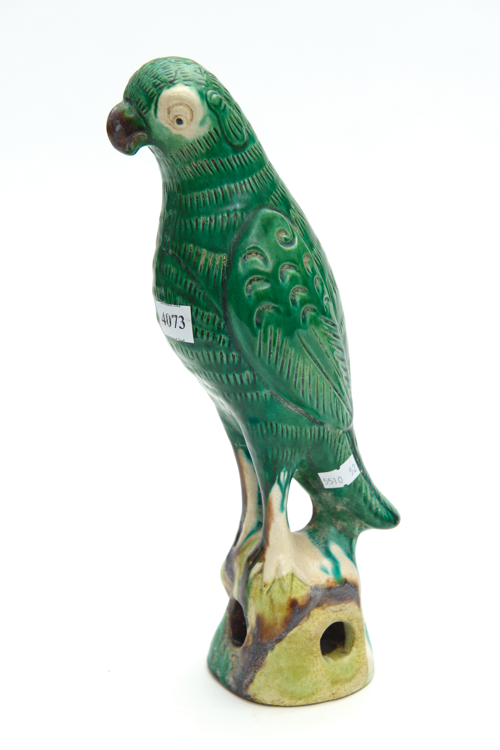 A LARGE CHINESE GREEN GLAZED POTTERY PARROT, 31 CM HIGH