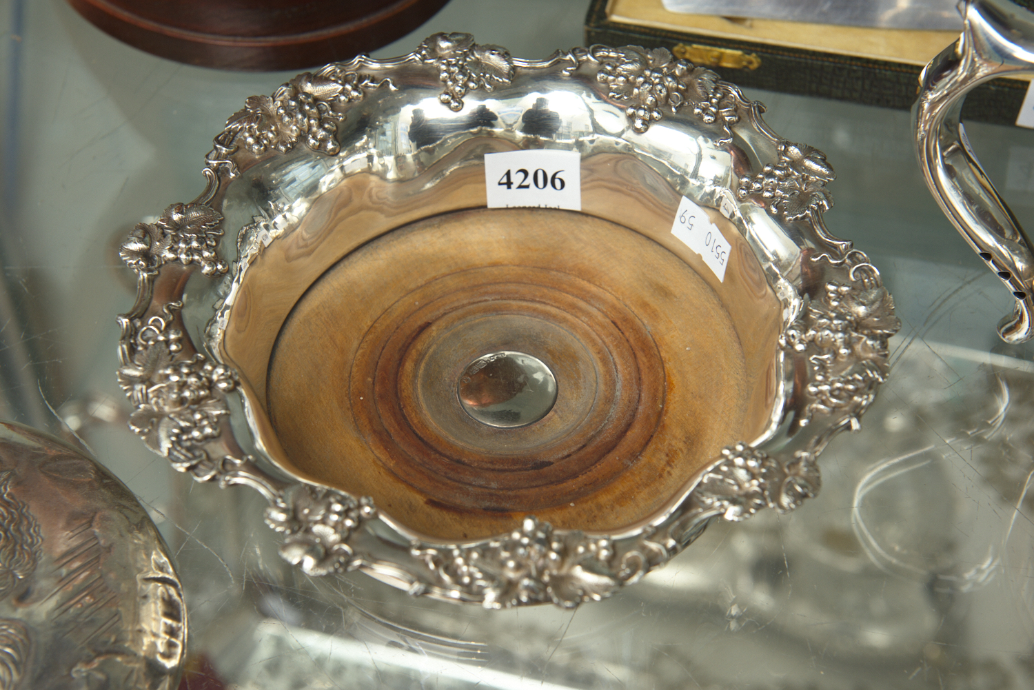 VICTORIAN STERLING SILVER & WOODEN BASED GRAPE PATTERN BOTTLE COASTER