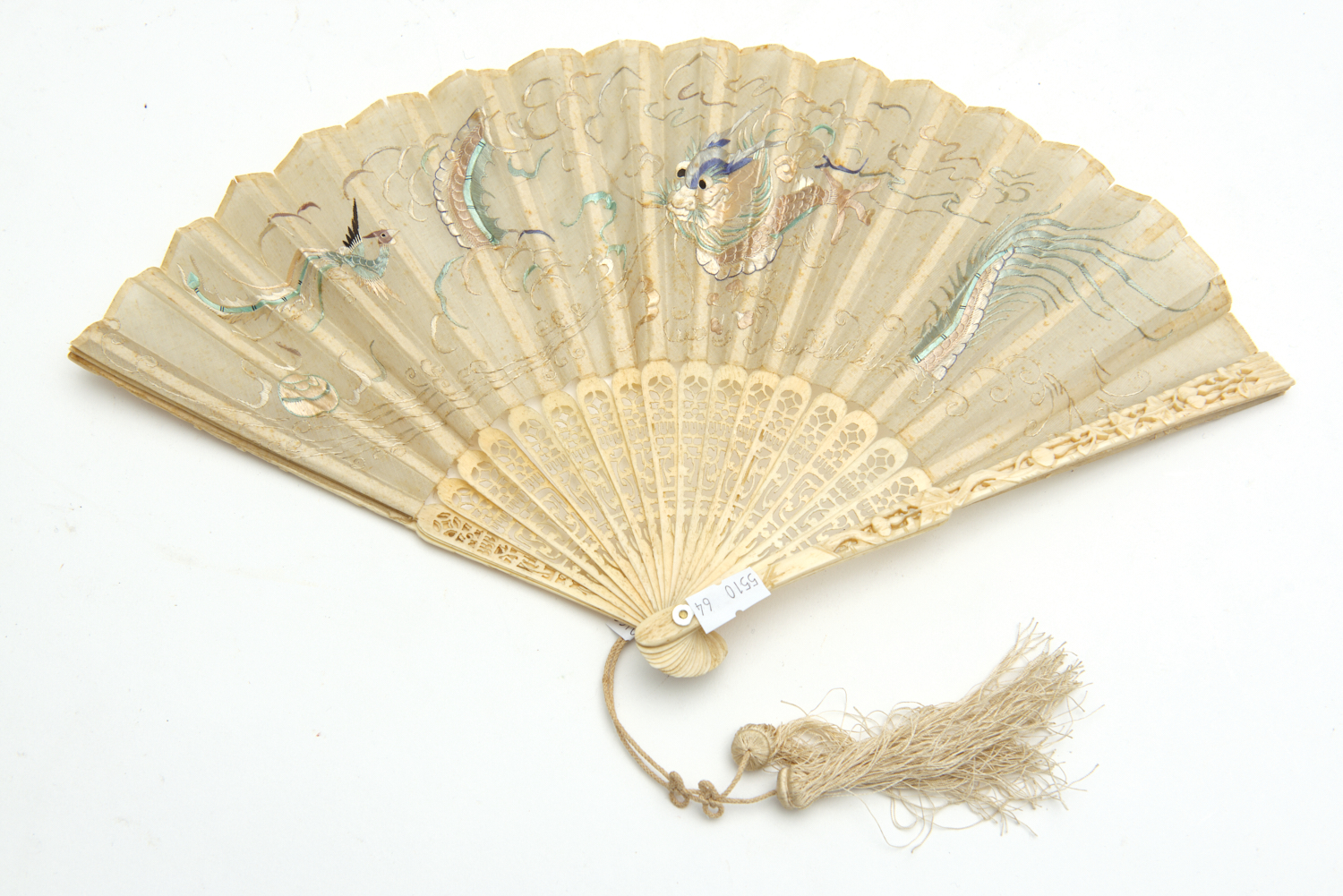 SCATTERED SPOTTING TO THE SILK GROUND AND AREAS WHERE THE MATERIAL HAS PERISHED AND SPLIT; BREAK TO TWO SECTIONS OF BONE, HOWEVER THE CARVED SECTIONS ARE IN GOOD ORDER