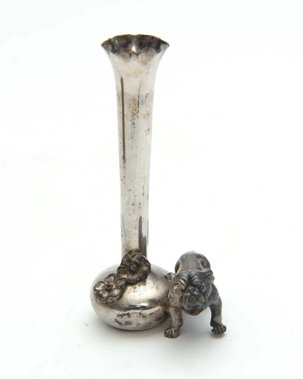 AN AMERICAN KNICKERBOKER SILVER PLATED BULLDOG ADORNED POSY VASE H.11CM (SMALL DELIVERY)