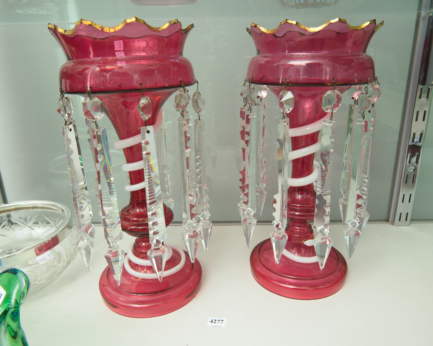 A PAIR OF VICTORIAN RUBY AND MILK GLASS LUSTRE VASES WITH MATCHED CRYSTAL DROPS H.37CM, LEONARD JOEL DELIVERY SIZE: SMALL